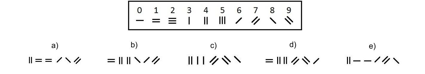 Body: 1Kategorie: Oddíl předpokladů ke studiu46. V rámečku je popsán klíč, dle kterého lze zapsat libovolné číslo systémem čárkovaných symbolů. Jaký je správný zápis číselné kombinace 4 1 1 6 8 7 v rámci tohoto systému?