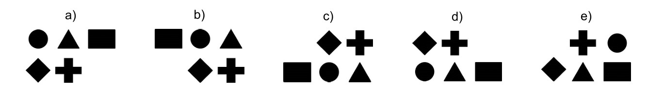 Body: 1Kategorie: Oddíl předpokladů ke studiu47. Na kterém z obrázků je trojúhelník umístěný vlevo od obdélníku, pod křížem, který je vlevo od kruhu?
