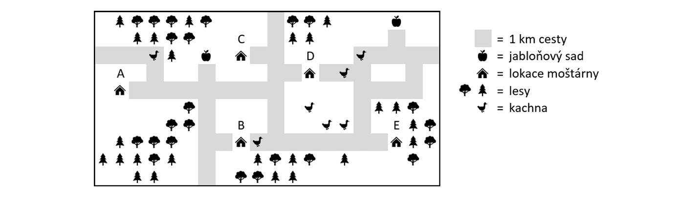 Body: 1Kategorie: Oddíl předpokladů ke studiu50. Z obou jabloňových sadů vyjede jedno jablky plně naložené nákladní auto do každé z moštáren. Do každé moštárny tak dojedou dvě auta. Moštárny za tento svoz platí pevnou cenu za kilometr cesty. Která z moštáren za svoz zaplatí nejméně? Pozor, auta cestou nesmí přejet kachnu!