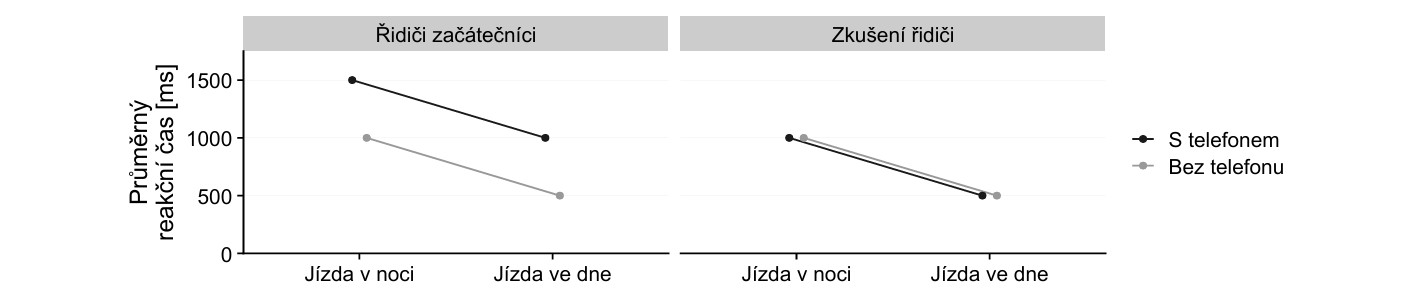 Body: 1Kategorie: Oddíl předpokladů ke studiu51. V dopravně psychologickém experimentu bylo zkoumáno, které faktory ovlivňují rychlost reakce řidiče. Účastníci řídili automobil po předepsané trase, na které jim v nečekaný moment vstoupila do cesty figurantka. U každého řidiče byl zaznamenán reakční čas – tedy počet milisekund, který uplynul od výskytu překážky do sešlápnutí brzdového pedálu. Výzkumný soubor tvořili řidiči začátečníci i zkušení řidiči, část absolvovala trasu ve dne, část v noci. Někteří účastníci byli zároveň instruováni, aby během jízdy používali mobilní telefon. Celkem tak vzniklo osm kombinací experimentálních podmínek. Níže uvedený graf znázorňuje průměrný reakční čas ve všech těchto podmínkách.