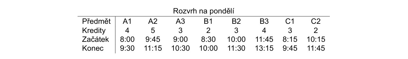 Body: 1Kategorie: Oddíl předpokladů ke studiu52. Následující tabulka zachycuje předměty, které si může student zapsat na pondělí, jejich kreditové ohodnocení a čas, kdy jsou vyučovány. Povinností studenta je účastnit se předmětu v celém jeho časovém rozsahu. Předměty jsou vyučovány v téže budově, přechody z jedné výuky do druhé lze zanedbat.