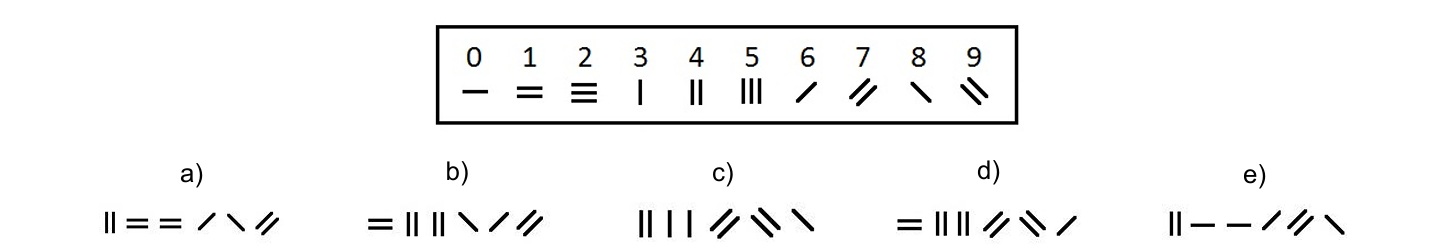 Body: 1Kategorie: Oddíl předpokladů ke studiu31. V rámečku je popsán klíč, dle kterého lze zapsat libovolné číslo systémem čárkovaných symbolů. Jaký je správný zápis číselné kombinace 4 1 1 6 8 7 v rámci tohoto systému?