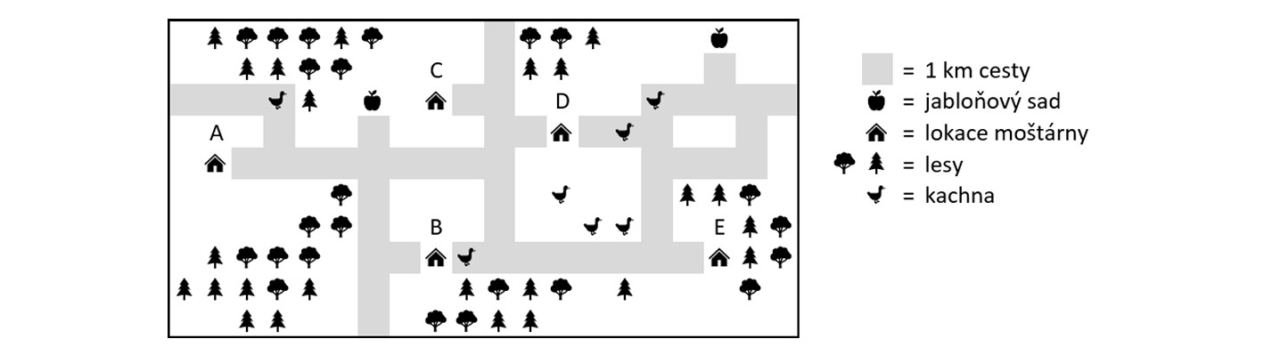 Body: 1Kategorie: Oddíl předpokladů ke studiu34. Z obou jabloňových sadů vyjede jedno jablky plně naložené nákladní auto do každé z moštáren. Do každé moštárny tak dojedou dvě auta. Moštárny za tento svoz platí pevnou cenu za kilometr cesty. Která z moštáren za svoz zaplatí nejméně? Pozor, auta cestou nesmí přejet kachnu!