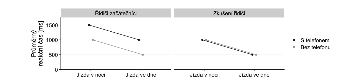 Body: 1Kategorie: Oddíl předpokladů ke studiu51. V dopravně psychologickém experimentu bylo zkoumáno, které faktory ovlivňují rychlost reakce řidiče. Účastníci řídili automobil po předepsané trase, na které jim v nečekaný moment vstoupila do cesty figurantka. U každého řidiče byl zaznamenán reakční čas – tedy počet milisekund, který uplynul od výskytu překážky do sešlápnutí brzdového pedálu. Výzkumný soubor tvořili řidiči začátečníci i zkušení řidiči, část absolvovala trasu ve dne, část v noci. Někteří účastníci byli zároveň instruováni, aby během jízdy používali mobilní telefon. Celkem tak vzniklo osm kombinací experimentálních podmínek. Níže uvedený graf znázorňuje průměrný reakční čas ve všech těchto podmínkách.