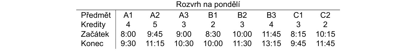 Body: 1Kategorie: Oddíl předpokladů ke studiu52. Následující tabulka zachycuje předměty, které si může student zapsat na pondělí, jejich kreditové ohodnocení a čas, kdy jsou vyučovány. Povinností studenta je účastnit se předmětu v celém jeho časovém rozsahu. Předměty jsou vyučovány v téže budově, přechody z jedné výuky do druhé lze zanedbat.