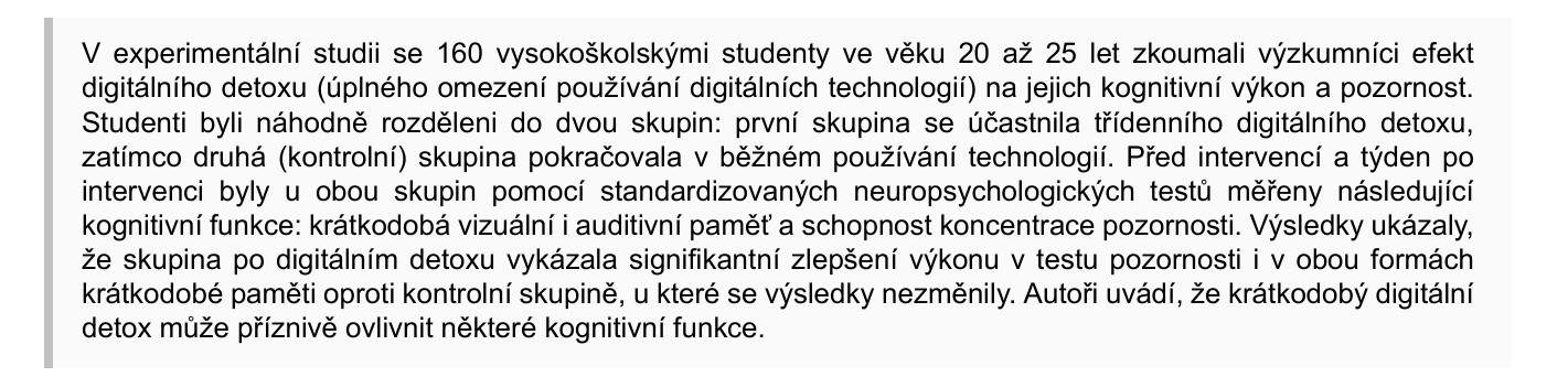 Body: 1Kategorie: Oddíl předpokladů ke studiu56. Vyberte tvrzení, které je v rozporu s uvedenými výzkumnými zjištěními nebo je hrubě dezinterpretuje.